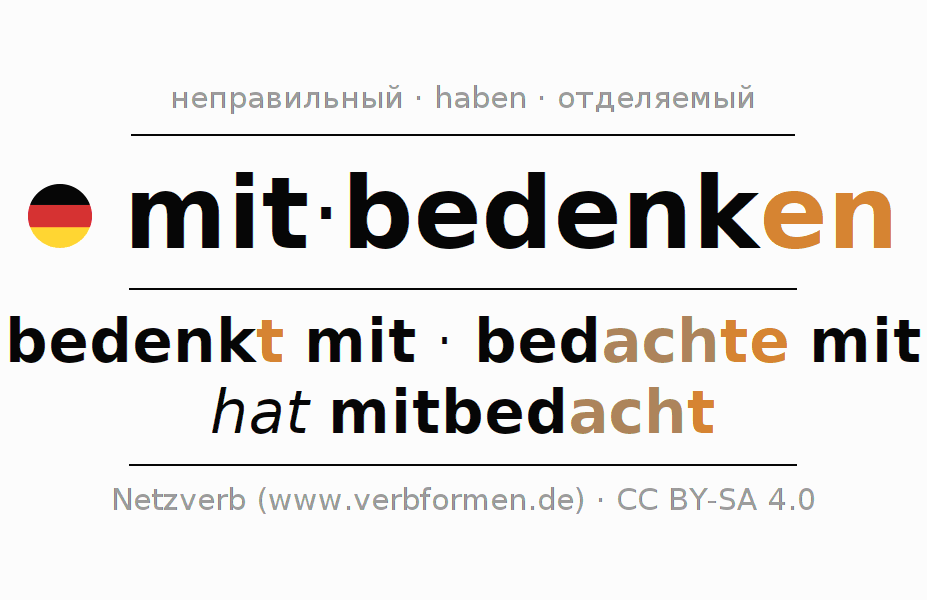 Спряжение mitbedenken (учитывать дополнительно) в прошедшем времени претерит: ich bedachte mit, du bedachtest mit, er bedachte mit, wir bedachten mit, ihr bedachtet mit, sie bedachten mit.