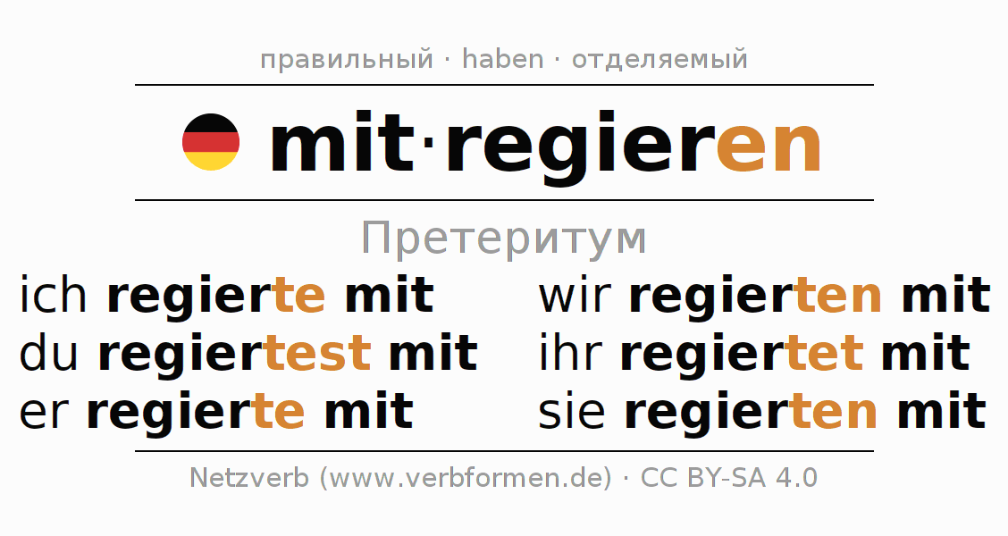 Спряжение mitregieren (участвовать в управлении) в прошедшем времени претерит: ich regierte mit, du regiertest mit, er regierte mit, wir regierten mit, ihr regiertet mit, sie regierten mit.