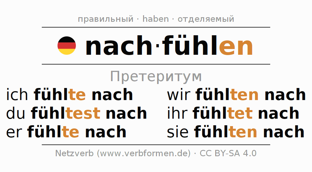 Спряжение nachfühlen (воспринять, понимать) в прошедшем времени претерит: ich fühlte nach, du fühltest nach, er fühlte nach, wir fühlten nach, ihr fühltet nach, sie fühlten nach.