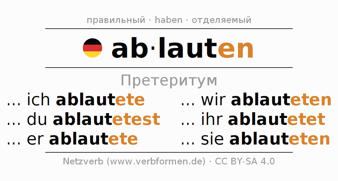 Спряжение ablauten в Претеритум Индикатив Прошлое время Действительный залог (актив): ... ich ablautete, ... du ablautetest, ... er ablautete, ... wir ablauteten, ... ihr ablautetet, ... sie ablauteten.Образование этих форм происходит по определённым грамматическим правилам. Так же спрягаются простые глагольные формы ablauten в Претеритум. Kомментарии ☆