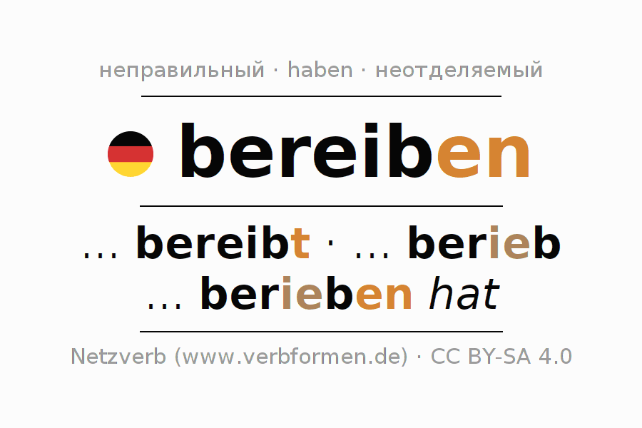 Спряжение bereiben в Претеритум Индикатив Прошлое время Действительный залог (актив): ... ich berieb, ... du beriebst, ... er berieb, ... wir berieben, ... ihr beriebt, ... sie berieben.Образование этих форм происходит по определённым грамматическим правилам. Так же спрягаются простые глагольные формы bereiben в Претеритум. Kомментарии ☆