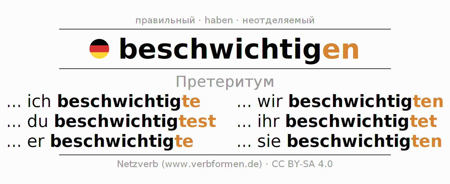 Спряжение beschwichtigen в Претеритум Индикатив Прошлое время Действительный залог (актив): ... ich beschwichtigte, ... du beschwichtigtest, ... er beschwichtigte, ... wir beschwichtigten, ... ihr beschwichtigtet, ... sie beschwichtigten.Образование этих форм происходит по определённым грамматическим правилам. Так же спрягаются простые глагольные формы beschwichtigen в Претеритум. Kомментарии ☆