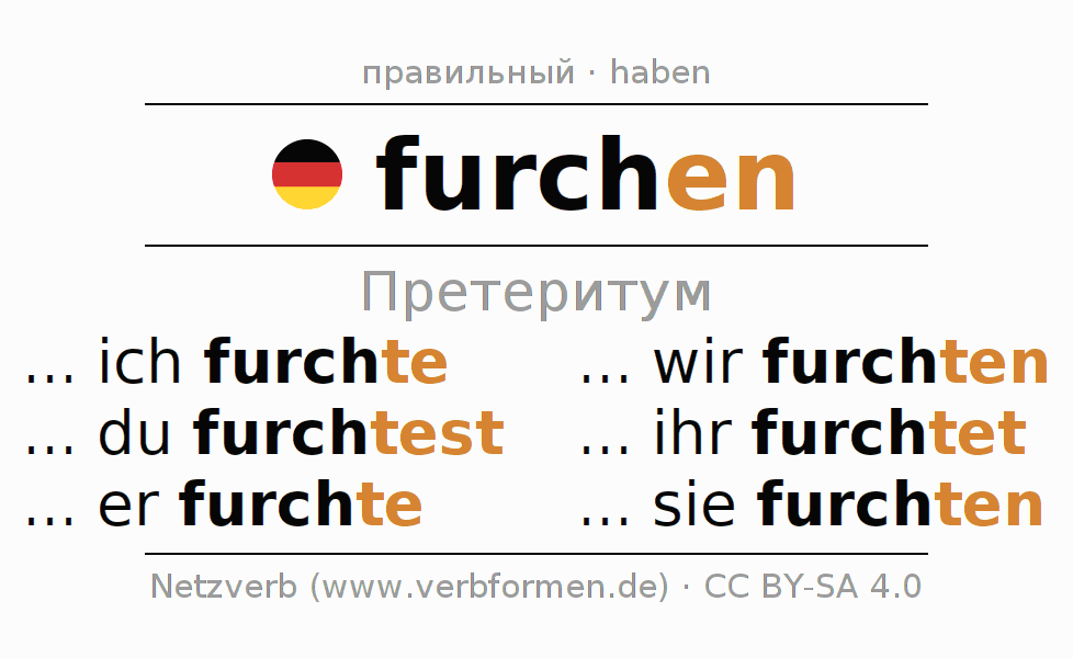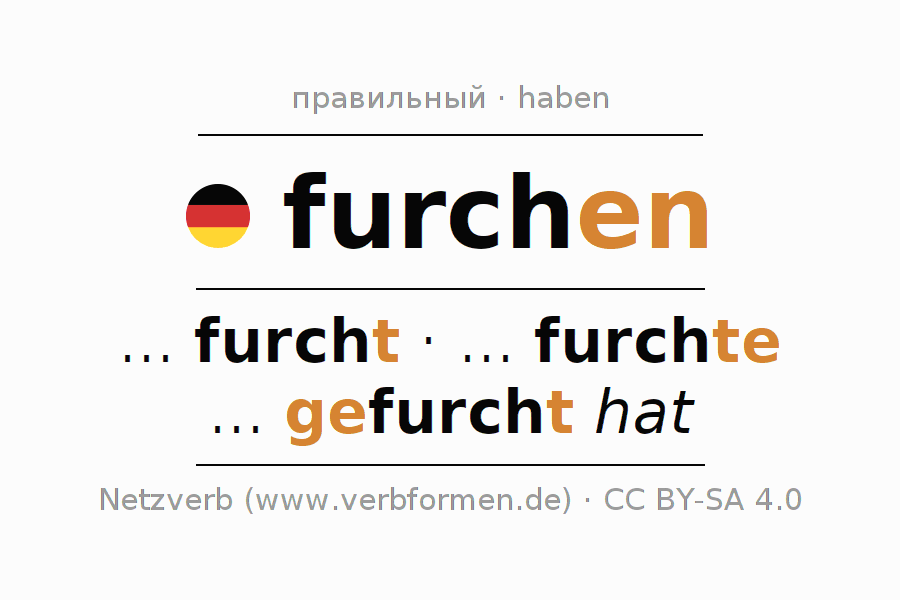 Спряжение furchen в Претеритум Индикатив Прошлое время Действительный залог (актив): ... ich furchte, ... du furchtest, ... er furchte, ... wir furchten, ... ihr furchtet, ... sie furchten.Образование этих форм происходит по определённым грамматическим правилам. Так же спрягаются простые глагольные формы furchen в Претеритум. Kомментарии ☆