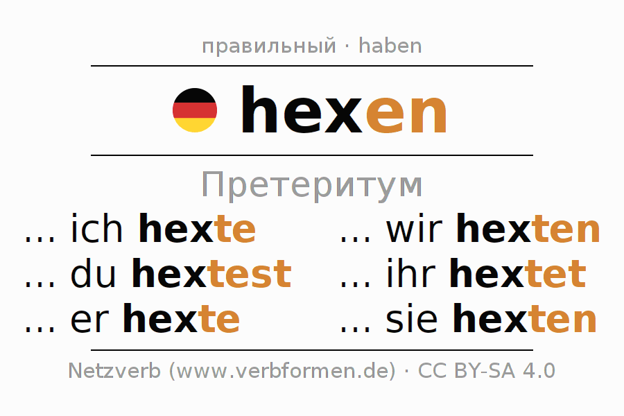 Спряжение hexen в Претеритум Индикатив Прошлое время Действительный залог (актив): ... ich hexte, ... du hextest, ... er hexte, ... wir hexten, ... ihr hextet, ... sie hexten.Образование этих форм происходит по определённым грамматическим правилам. Так же спрягаются простые глагольные формы hexen в Претеритум. Kомментарии ☆