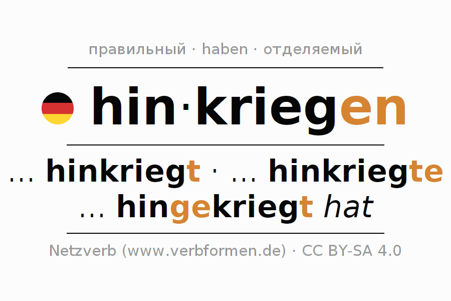 Спряжение hinkriegen в Претеритум Индикатив Прошлое время Действительный залог (актив): ... ich hinkriegte, ... du hinkriegtest, ... er hinkriegte, ... wir hinkriegten, ... ihr hinkriegtet, ... sie hinkriegten.Образование этих форм происходит по определённым грамматическим правилам. Так же спрягаются простые глагольные формы hinkriegen в Претеритум. Kомментарии ☆