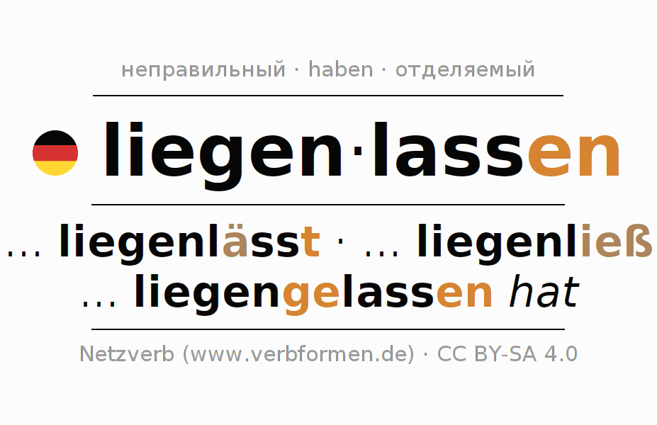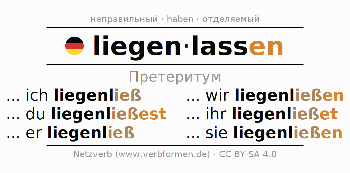 Спряжение liegenlassen в Претеритум Индикатив Прошлое время Действительный залог (актив): ... ich liegenließ, ... du liegenließ(es)t, ... er liegenließ, ... wir liegenließen, ... ihr liegenließ(e)t, ... sie liegenließen.Образование этих форм происходит по определённым грамматическим правилам. Так же спрягаются простые глагольные формы liegenlassen в Претеритум. Kомментарии ☆