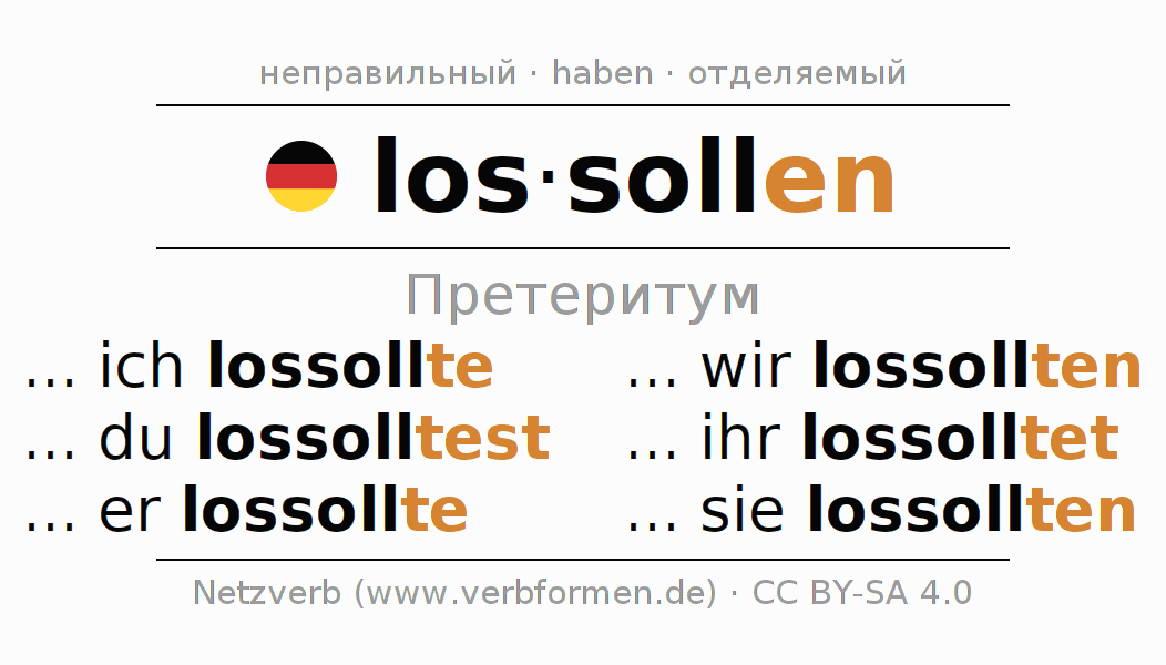 Спряжение lossollen в Претеритум Индикатив Прошлое время Действительный залог (актив): ... ich lossollte, ... du lossolltest, ... er lossollte, ... wir lossollten, ... ihr lossolltet, ... sie lossollten.Образование этих форм происходит по определённым грамматическим правилам. Так же спрягаются простые глагольные формы lossollen в Претеритум. Kомментарии ☆