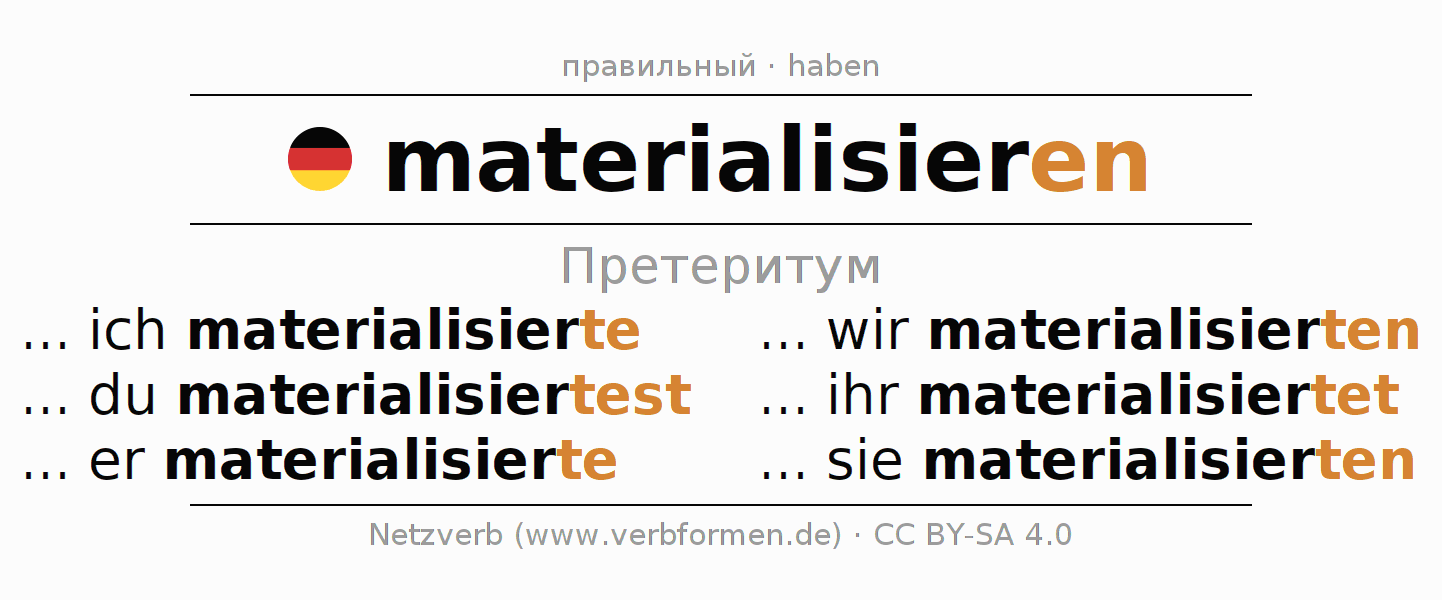 Спряжение materialisieren в Претеритум Индикатив Прошлое время Действительный залог (актив): ... ich materialisierte, ... du materialisiertest, ... er materialisierte, ... wir materialisierten, ... ihr materialisiertet, ... sie materialisierten.Образование этих форм происходит по определённым грамматическим правилам. Так же спрягаются простые глагольные формы materialisieren в Претеритум. Kомментарии ☆