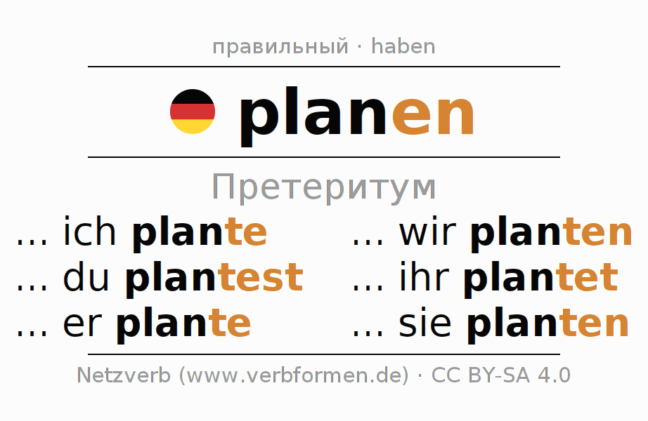 Спряжение planen в Претеритум Индикатив Прошлое время Действительный залог (актив): ... ich plante, ... du plantest, ... er plante, ... wir planten, ... ihr plantet, ... sie planten.Образование этих форм происходит по определённым грамматическим правилам. Так же спрягаются простые глагольные формы planen в Претеритум. Kомментарии ☆