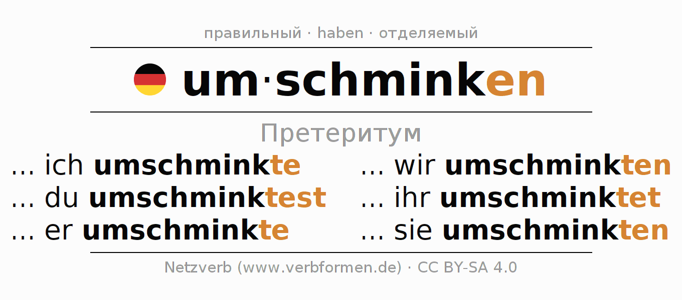 Этот глагол umschminken полностью спрягается во всех лицах и числах Претеритум Индикатив.