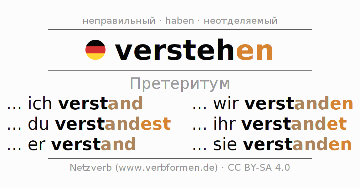 Спряжение verstehen в Претеритум Индикатив Прошлое время Действительный залог (актив): ... ich verstand, ... du verstand(e)st, ... er verstand, ... wir verstanden, ... ihr verstandet, ... sie verstanden.Образование этих форм происходит по определённым грамматическим правилам. Так же спрягаются простые глагольные формы verstehen в Претеритум. 1Комментарий ☆5.0