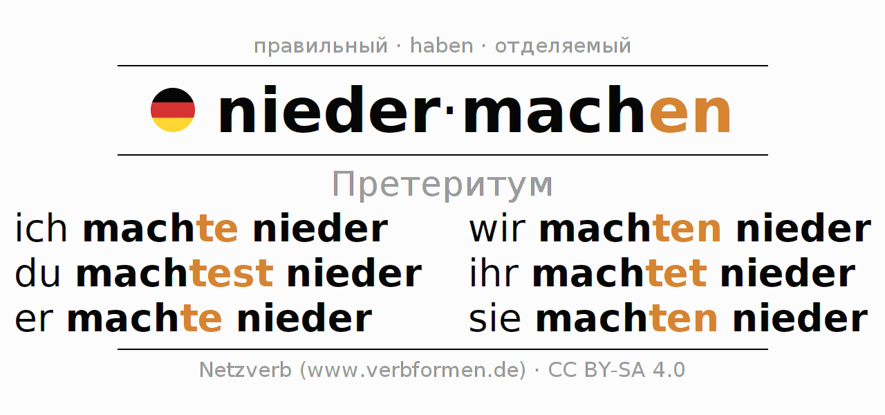 Этот глагол niedermachen полностью спрягается во всех лицах и числах Претеритум Индикатив.