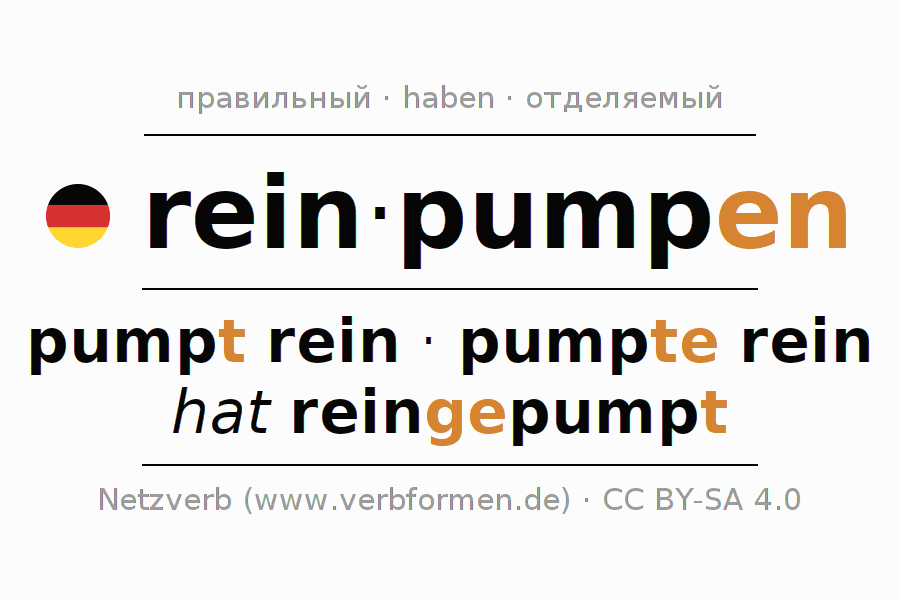 Спряжение reinpumpen (вкладывать, впрыскивать) в прошедшем времени претерит: ich pumpte rein, du pumptest rein, er pumpte rein, wir pumpten rein, ihr pumptet rein, sie pumpten rein.