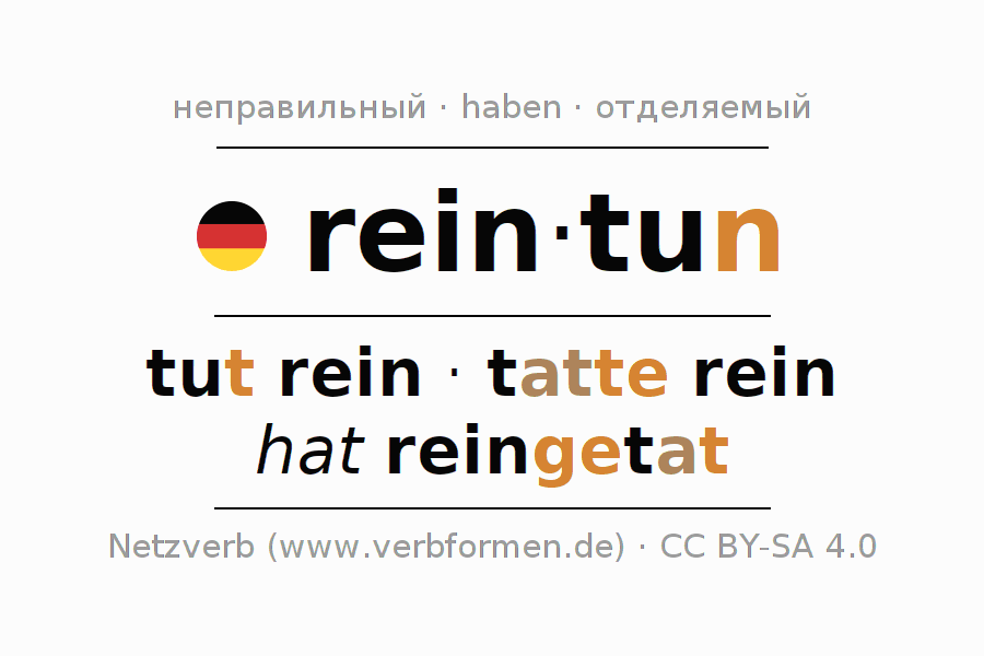 Спряжение reintun (положить, вложить) в прошедшем времени претерит: ich tatte rein, du tattest rein, er tatte rein, wir tatten rein, ihr tattet rein, sie tatten rein.