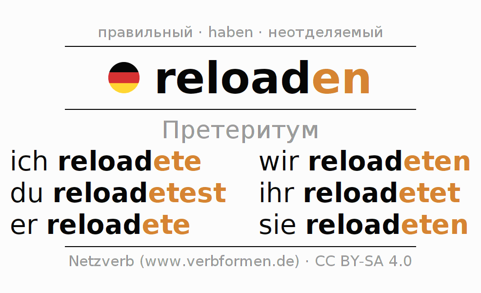 Спряжение reloaden (перезагрузить) в прошедшем времени претерит: ich reloadete, du reloadetest, er reloadete, wir reloadeten, ihr reloadetet, sie reloadeten.