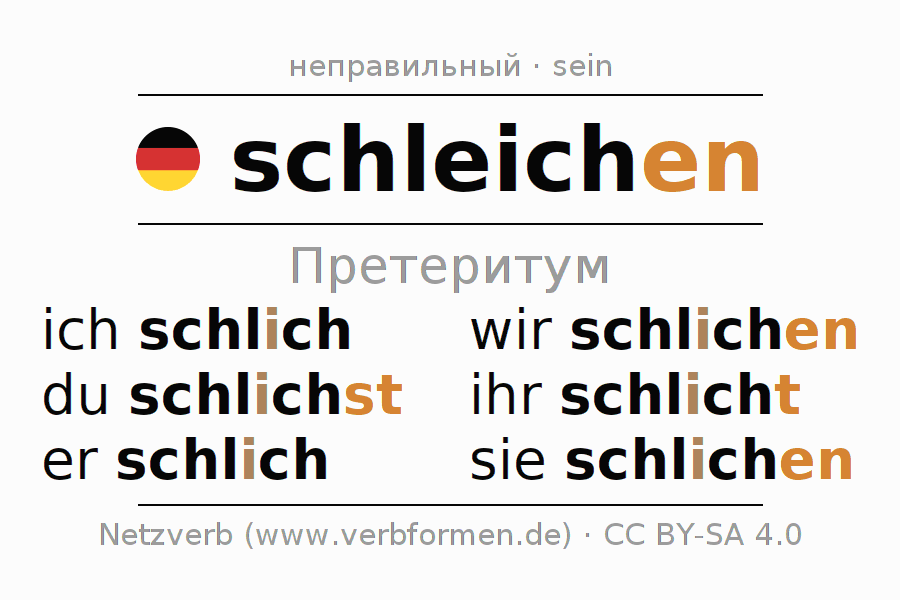 Спряжение schleichen (красться, подкрадываться) в прошедшем времени претерит: ich schlich, du schlichst, er schlich, wir schlichen, ihr schlicht, sie schlichen.