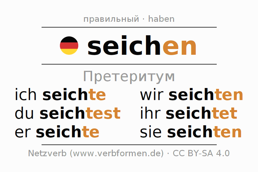 Спряжение seichen (болтать, мочиться) в прошедшем времени претерит: ich seichte, du seichtest, er seichte, wir seichten, ihr seichtet, sie seichten.
