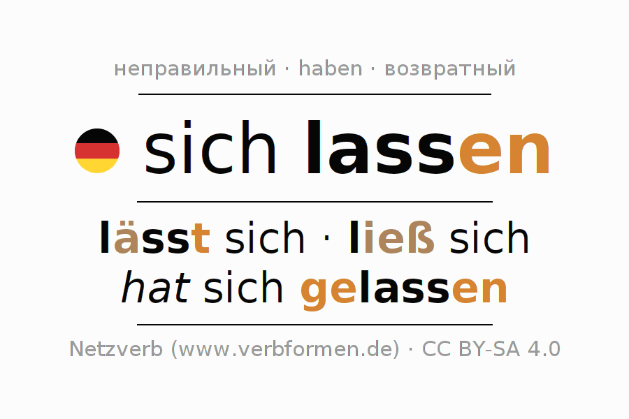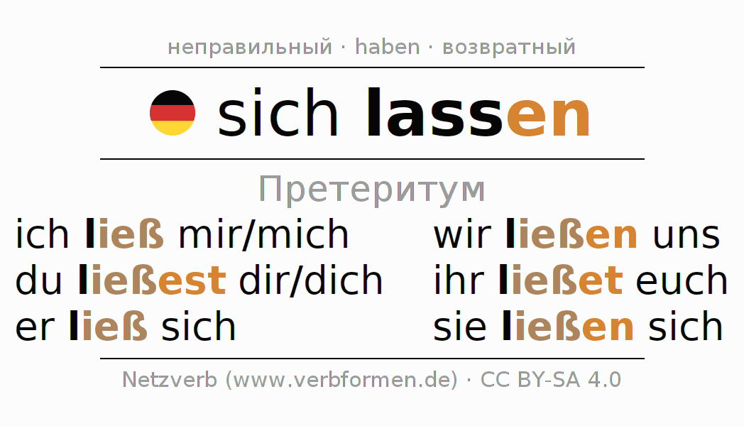 Спряжение sich lassen (позволять, оставить) в прошедшем времени претерит: ich ließ mir/mich, du ließ(es)t dir/dich, er ließ sich, wir ließen uns, ihr ließ(e)t euch, sie ließen sich.