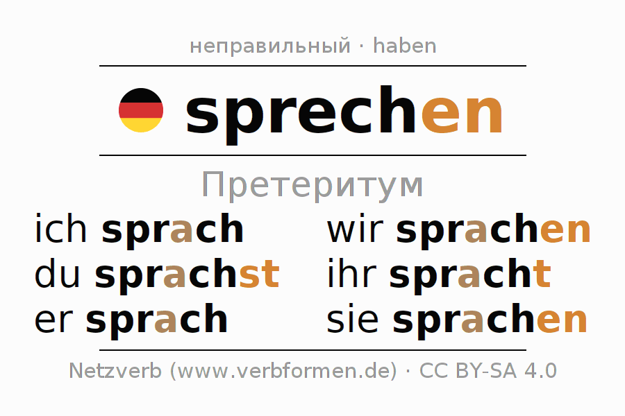 Спряжение sprechen (говорить, разговаривать) в прошедшем времени претерит: ich sprach, du sprachst, er sprach, wir sprachen, ihr spracht, sie sprachen.