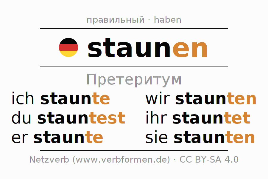 Спряжение staunen (удивляться, изумляться) в прошедшем времени претерит: ich staunte, du stauntest, er staunte, wir staunten, ihr stauntet, sie staunten.
