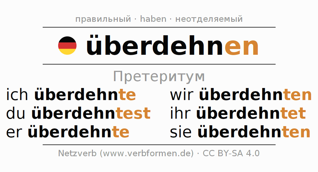 Спряжение überdehnen (перерастяжение, перетягивать) в прошедшем времени претерит: ich überdehnte, du überdehntest, er überdehnte, wir überdehnten, ihr überdehntet, sie überdehnten.