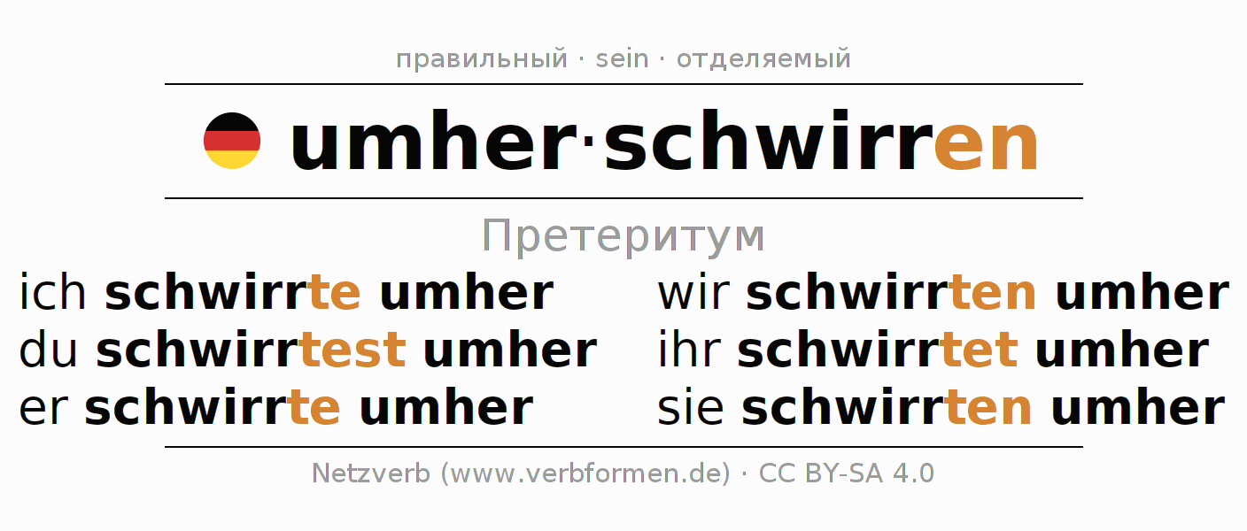 Спряжение umherschwirren (блуждать, кружиться) в прошедшем времени претерит: ich schwirrte umher, du schwirrtest umher, er schwirrte umher, wir schwirrten umher, ihr schwirrtet umher, sie schwirrten umher.