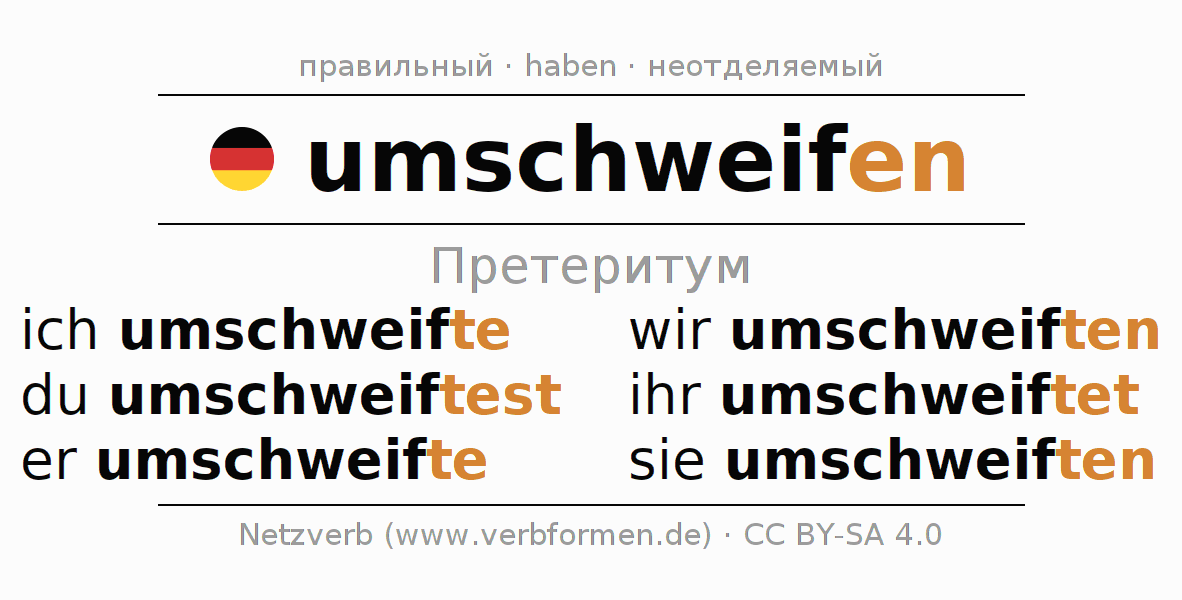 Спряжение umschweifen (кружить, обходить) в прошедшем времени претерит: ich umschweifte, du umschweiftest, er umschweifte, wir umschweiften, ihr umschweiftet, sie umschweiften.