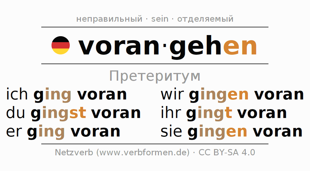 Спряжение vorangehen (идти впереди, предшествовать) в прошедшем времени претерит: ich ging voran, du gingst voran, er ging voran, wir gingen voran, ihr gingt voran, sie gingen voran.