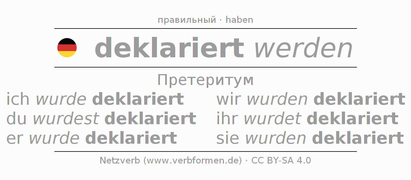 Спряжение deklarieren в Претеритум Индикатив Прошлое время Пассив с werden: ich wurde deklariert, du wurdest deklariert, er wurde deklariert, wir wurden deklariert, ihr wurdet deklariert, sie wurden deklariert.Образование этих форм происходит по определённым грамматическим правилам. Так же спрягаются простые глагольные формы deklarieren в Претеритум. Kомментарии ☆