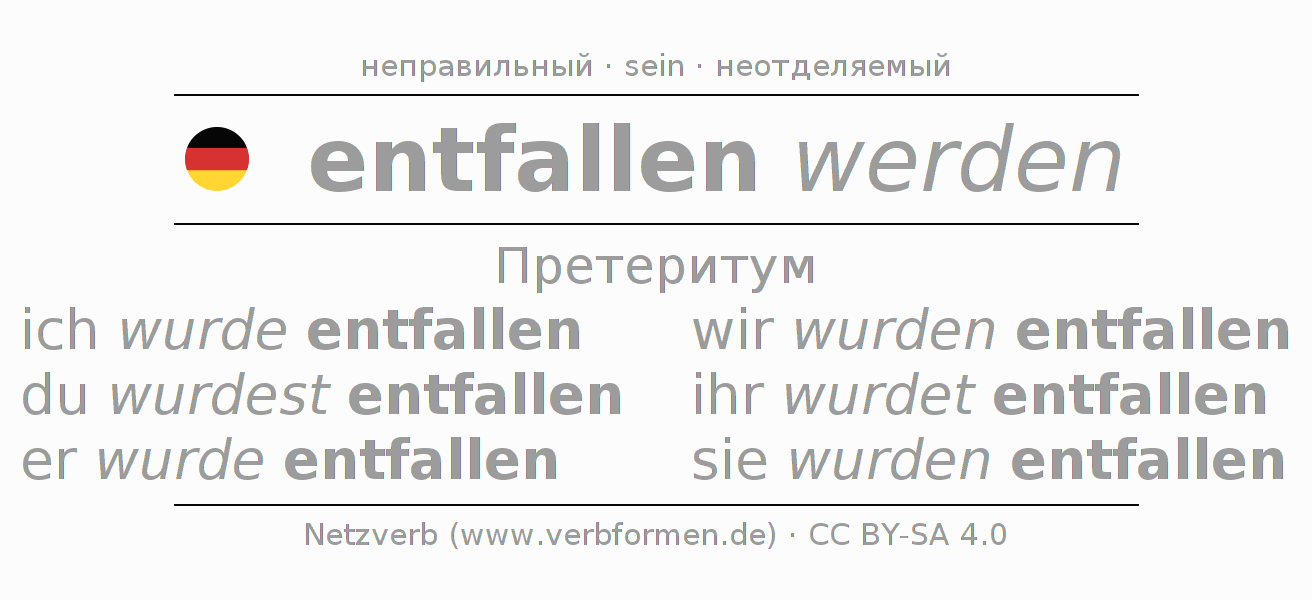 Спряжение entfallen в Претеритум Индикатив Прошлое время Пассив с werden: ich wurde entfallen, du wurdest entfallen, er wurde entfallen, wir wurden entfallen, ihr wurdet entfallen, sie wurden entfallen.Образование этих форм происходит по определённым грамматическим правилам. Так же спрягаются простые глагольные формы entfallen в Претеритум. Kомментарии ☆