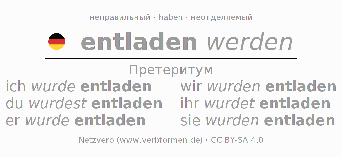 Спряжение entladen в Претеритум Индикатив Прошлое время Пассив с werden: ich wurde entladen, du wurdest entladen, er wurde entladen, wir wurden entladen, ihr wurdet entladen, sie wurden entladen.Образование этих форм происходит по определённым грамматическим правилам. Так же спрягаются простые глагольные формы entladen в Претеритум. Kомментарии ☆