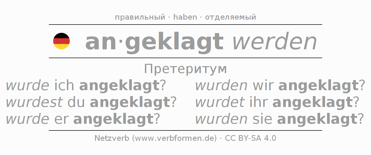 Спряжение anklagen в Претеритум Индикатив Прошлое время Пассив с werden: wurde ich angeklagt?, wurdest du angeklagt?, wurde er angeklagt?, wurden wir angeklagt?, wurdet ihr angeklagt?, wurden sie angeklagt?.Образование этих форм происходит по определённым грамматическим правилам. Так же спрягаются простые глагольные формы anklagen в Претеритум. Kомментарии ☆