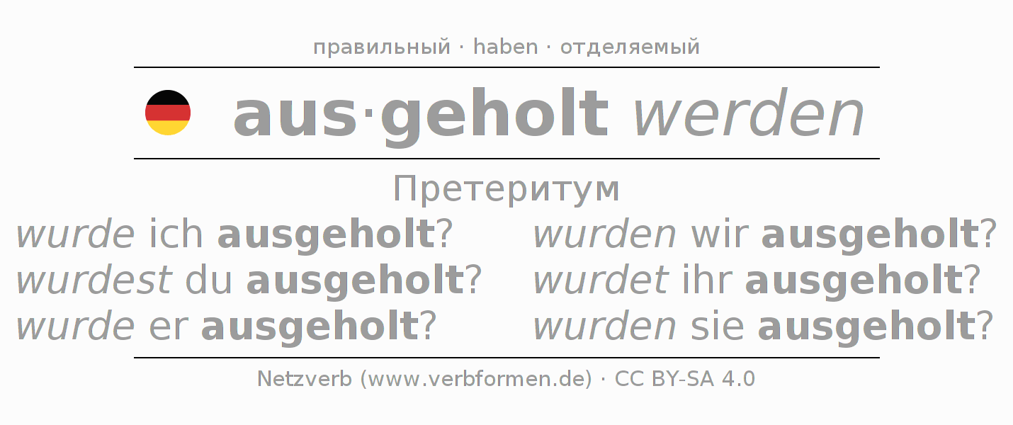 Спряжение ausholen в Претеритум Индикатив Прошлое время Пассив с werden: wurde ich ausgeholt?, wurdest du ausgeholt?, wurde er ausgeholt?, wurden wir ausgeholt?, wurdet ihr ausgeholt?, wurden sie ausgeholt?.Образование этих форм происходит по определённым грамматическим правилам. Так же спрягаются простые глагольные формы ausholen в Претеритум. Kомментарии ☆