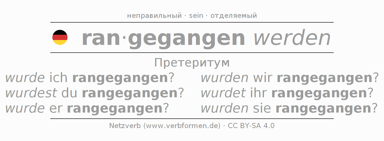 Спряжение rangehen в Претеритум Индикатив Прошлое время Пассив с werden: wurde ich rangegangen?, wurdest du rangegangen?, wurde er rangegangen?, wurden wir rangegangen?, wurdet ihr rangegangen?, wurden sie rangegangen?.Образование этих форм происходит по определённым грамматическим правилам. Так же спрягаются простые глагольные формы rangehen в Претеритум. Kомментарии ☆
