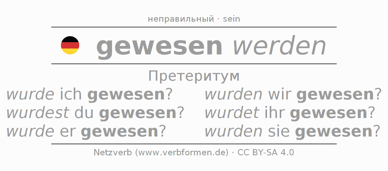 Спряжение sein в Претеритум Индикатив Прошлое время Пассив с werden: wurde ich gewesen?, wurdest du gewesen?, wurde er gewesen?, wurden wir gewesen?, wurdet ihr gewesen?, wurden sie gewesen?.Образование этих форм происходит по определённым грамматическим правилам. Так же спрягаются простые глагольные формы sein в Претеритум. 9Комментарии ☆4.6
