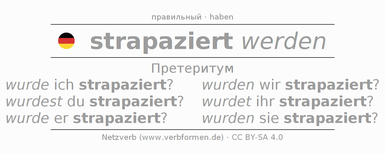 Спряжение strapazieren в Претеритум Индикатив Прошлое время Пассив с werden: wurde ich strapaziert?, wurdest du strapaziert?, wurde er strapaziert?, wurden wir strapaziert?, wurdet ihr strapaziert?, wurden sie strapaziert?.Образование этих форм происходит по определённым грамматическим правилам. Так же спрягаются простые глагольные формы strapazieren в Претеритум. Kомментарии ☆