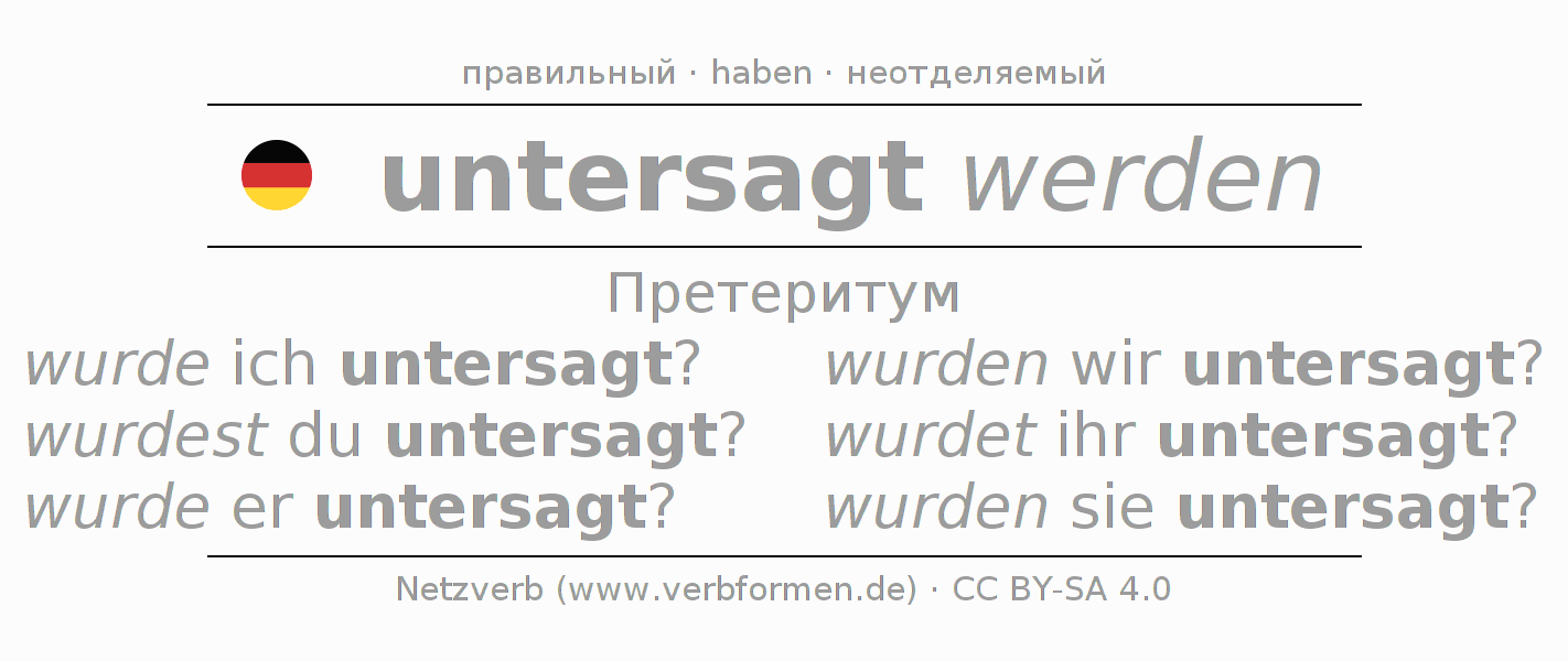 Спряжение untersagen в Претеритум Индикатив Прошлое время Пассив с werden: wurde ich untersagt?, wurdest du untersagt?, wurde er untersagt?, wurden wir untersagt?, wurdet ihr untersagt?, wurden sie untersagt?.Образование этих форм происходит по определённым грамматическим правилам. Так же спрягаются простые глагольные формы untersagen в Претеритум. Kомментарии ☆