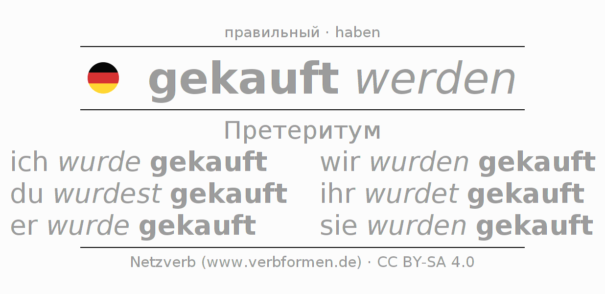 Спряжение kaufen в Претеритум Индикатив Прошлое время Пассив с werden: ich wurde gekauft, du wurdest gekauft, er wurde gekauft, wir wurden gekauft, ihr wurdet gekauft, sie wurden gekauft.Образование этих форм происходит по определённым грамматическим правилам. Так же спрягаются простые глагольные формы kaufen в Претеритум. 1Комментарий ☆5.0