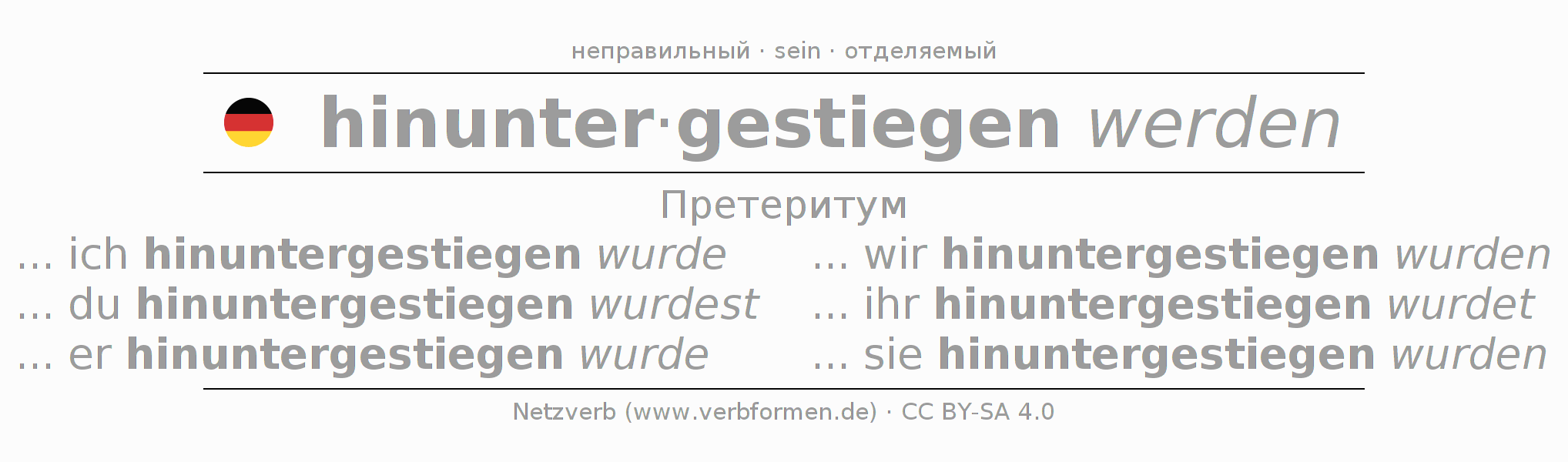 Спряжение hinuntersteigen в Претеритум Индикатив Прошлое время Пассив с werden: ... ich hinuntergestiegen wurde, ... du hinuntergestiegen wurdest, ... er hinuntergestiegen wurde, ... wir hinuntergestiegen wurden, ... ihr hinuntergestiegen wurdet, ... sie hinuntergestiegen wurden.Образование этих форм происходит по определённым грамматическим правилам. Так же спрягаются простые глагольные формы hinuntersteigen в Претеритум. Kомментарии ☆