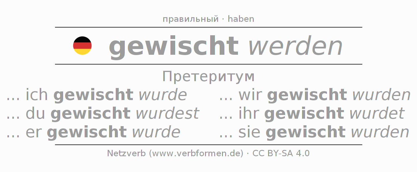 Спряжение wischen в Претеритум Индикатив Прошлое время Пассив с werden: ... ich gewischt wurde, ... du gewischt wurdest, ... er gewischt wurde, ... wir gewischt wurden, ... ihr gewischt wurdet, ... sie gewischt wurden.Образование этих форм происходит по определённым грамматическим правилам. Так же спрягаются простые глагольные формы wischen в Претеритум. Kомментарии ☆