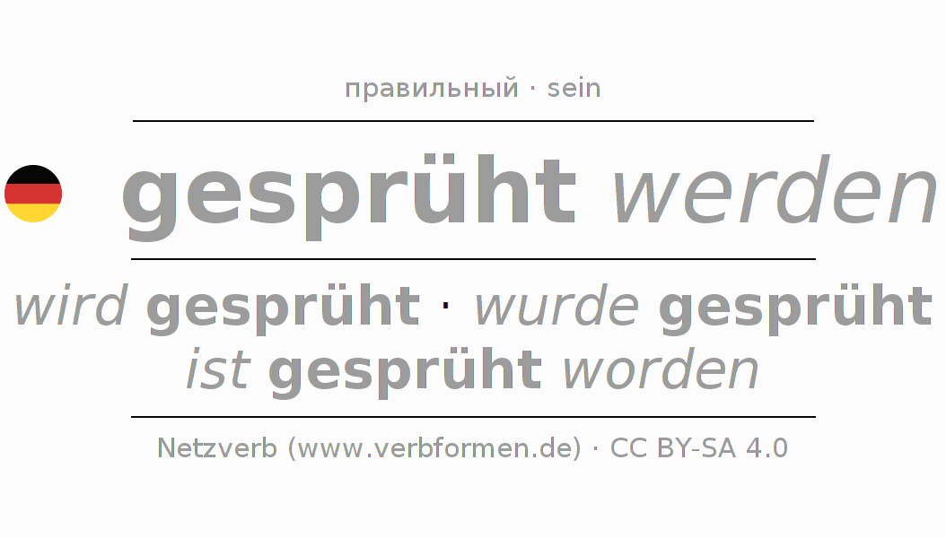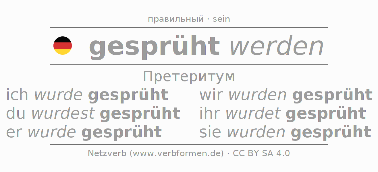 Спряжение sprühen в Претеритум Индикатив Прошлое время Пассив с werden: ich wurde gesprüht, du wurdest gesprüht, er wurde gesprüht, wir wurden gesprüht, ihr wurdet gesprüht, sie wurden gesprüht.Образование этих форм происходит по определённым грамматическим правилам. Так же спрягаются простые глагольные формы sprühen в Претеритум. Kомментарии ☆