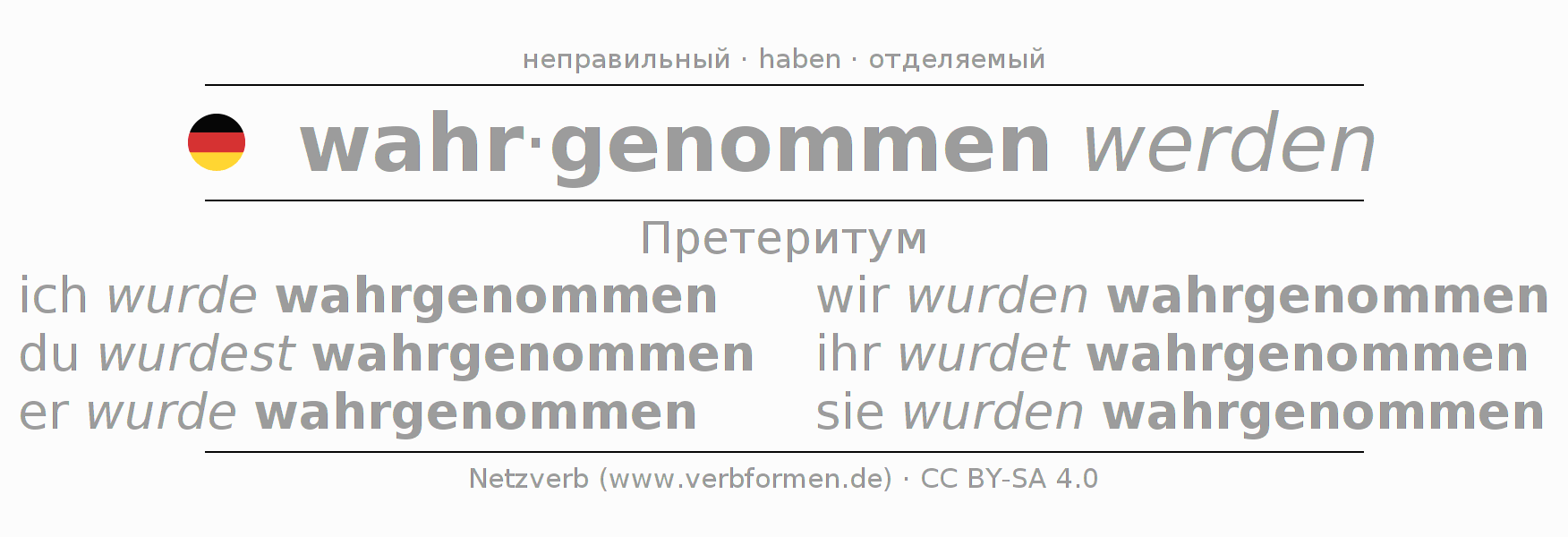 Спряжение wahrnehmen в Претеритум Индикатив Прошлое время Пассив с werden: ich wurde wahrgenommen, du wurdest wahrgenommen, er wurde wahrgenommen, wir wurden wahrgenommen, ihr wurdet wahrgenommen, sie wurden wahrgenommen.Образование этих форм происходит по определённым грамматическим правилам. Так же спрягаются простые глагольные формы wahrnehmen в Претеритум. Kомментарии ☆
