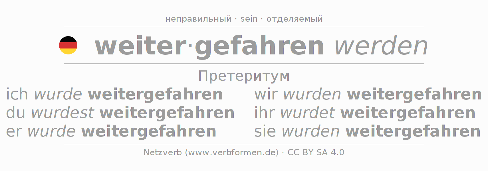 Спряжение weiterfahren в Претеритум Индикатив Прошлое время Пассив с werden: ich wurde weitergefahren, du wurdest weitergefahren, er wurde weitergefahren, wir wurden weitergefahren, ihr wurdet weitergefahren, sie wurden weitergefahren.Образование этих форм происходит по определённым грамматическим правилам. Так же спрягаются простые глагольные формы weiterfahren в Претеритум. Kомментарии ☆