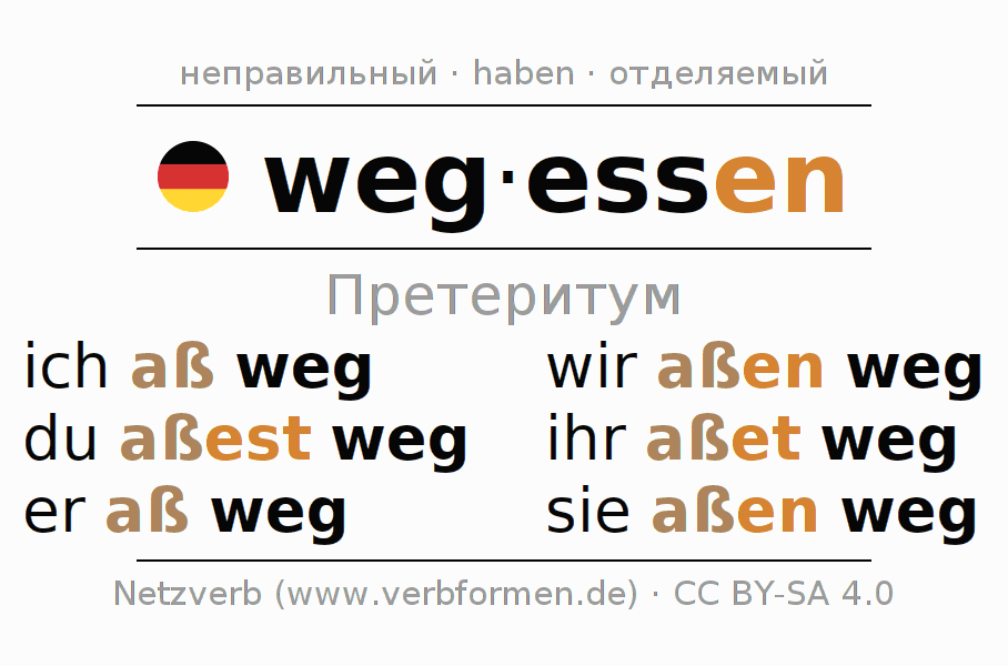 Спряжение wegessen (съесть, съесть чужое) в прошедшем времени претерит: ich aß weg, du aß(es)t weg, er aß weg, wir aßen weg, ihr aß(e)t weg, sie aßen weg.