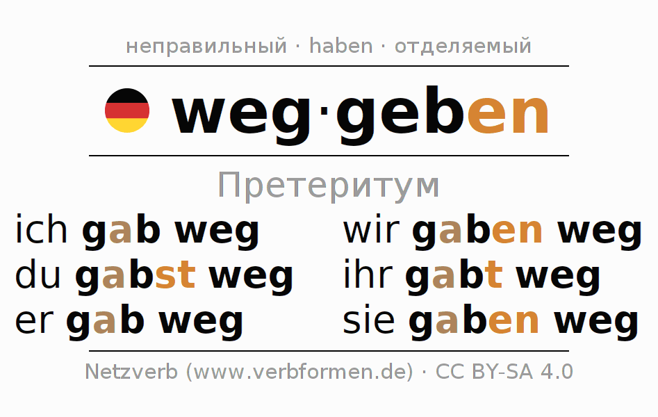 Спряжение weggeben (отдавать, отдать) в прошедшем времени претерит: ich gab weg, du gabst weg, er gab weg, wir gaben weg, ihr gabt weg, sie gaben weg.