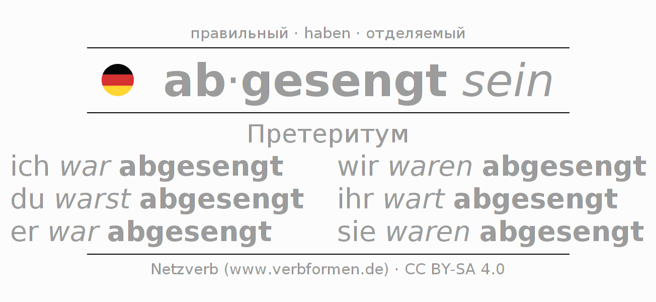 Спряжение absengen в Претеритум Индикатив Прошлое время Пассив с sein: ich war abgesengt, du warst abgesengt, er war abgesengt, wir waren abgesengt, ihr wart abgesengt, sie waren abgesengt.Образование этих форм происходит по определённым грамматическим правилам. Так же спрягаются простые глагольные формы absengen в Претеритум. Kомментарии ☆