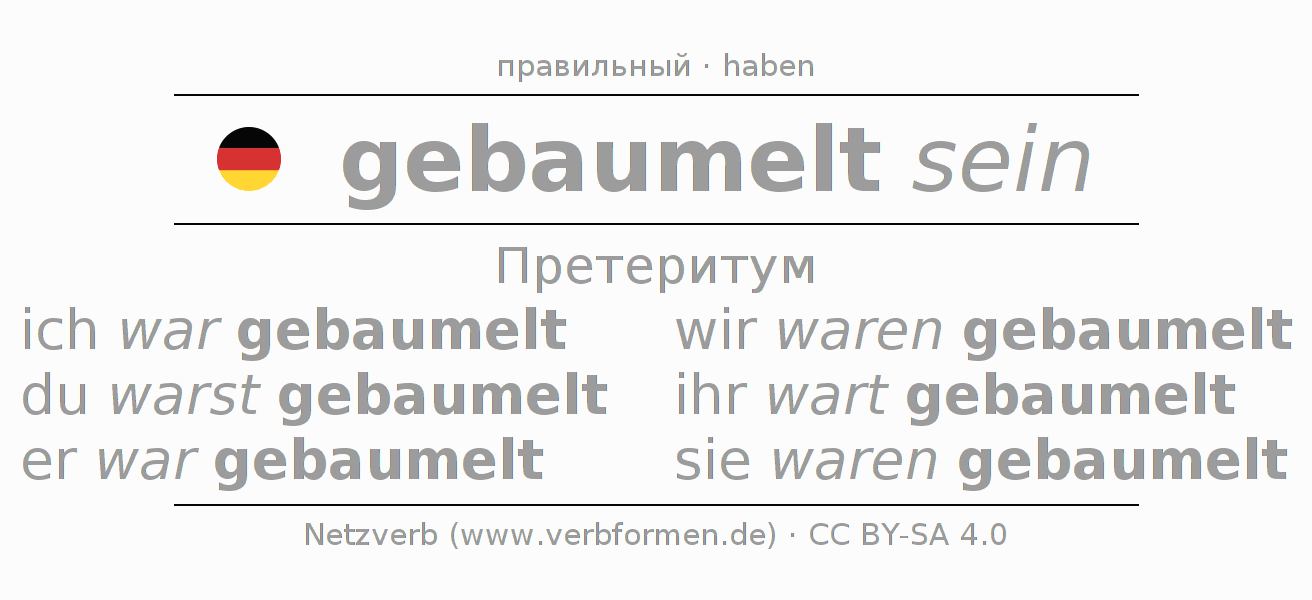 Спряжение baumeln в Претеритум Индикатив Прошлое время Пассив с sein: ich war gebaumelt, du warst gebaumelt, er war gebaumelt, wir waren gebaumelt, ihr wart gebaumelt, sie waren gebaumelt.Образование этих форм происходит по определённым грамматическим правилам. Так же спрягаются простые глагольные формы baumeln в Претеритум. Kомментарии ☆