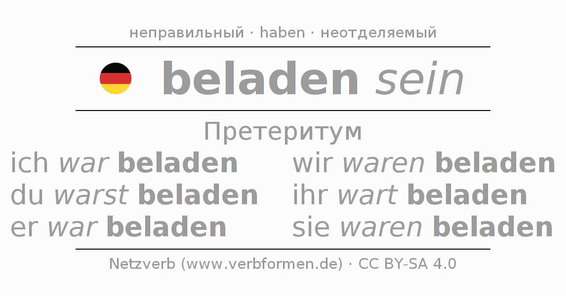 Спряжение beladen в Претеритум Индикатив Прошлое время Пассив с sein: ich war beladen, du warst beladen, er war beladen, wir waren beladen, ihr wart beladen, sie waren beladen.Образование этих форм происходит по определённым грамматическим правилам. Так же спрягаются простые глагольные формы beladen в Претеритум. Kомментарии ☆