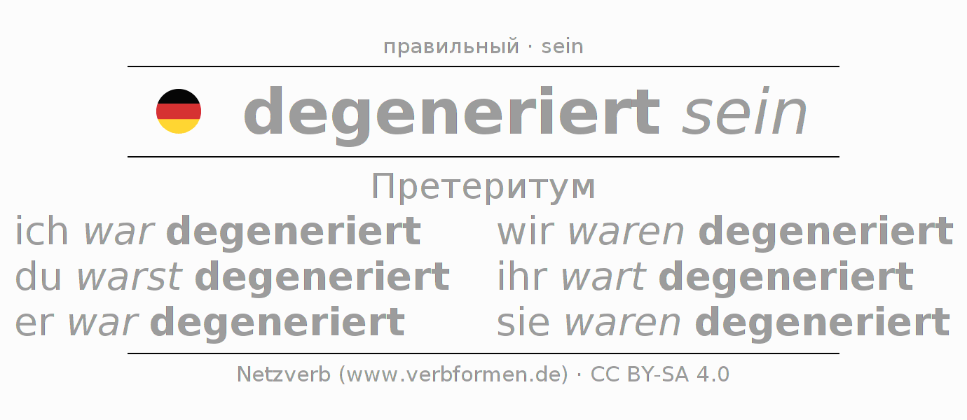 Спряжение degenerieren в Претеритум Индикатив Прошлое время Пассив с sein: ich war degeneriert, du warst degeneriert, er war degeneriert, wir waren degeneriert, ihr wart degeneriert, sie waren degeneriert.Образование этих форм происходит по определённым грамматическим правилам. Так же спрягаются простые глагольные формы degenerieren в Претеритум. Kомментарии ☆