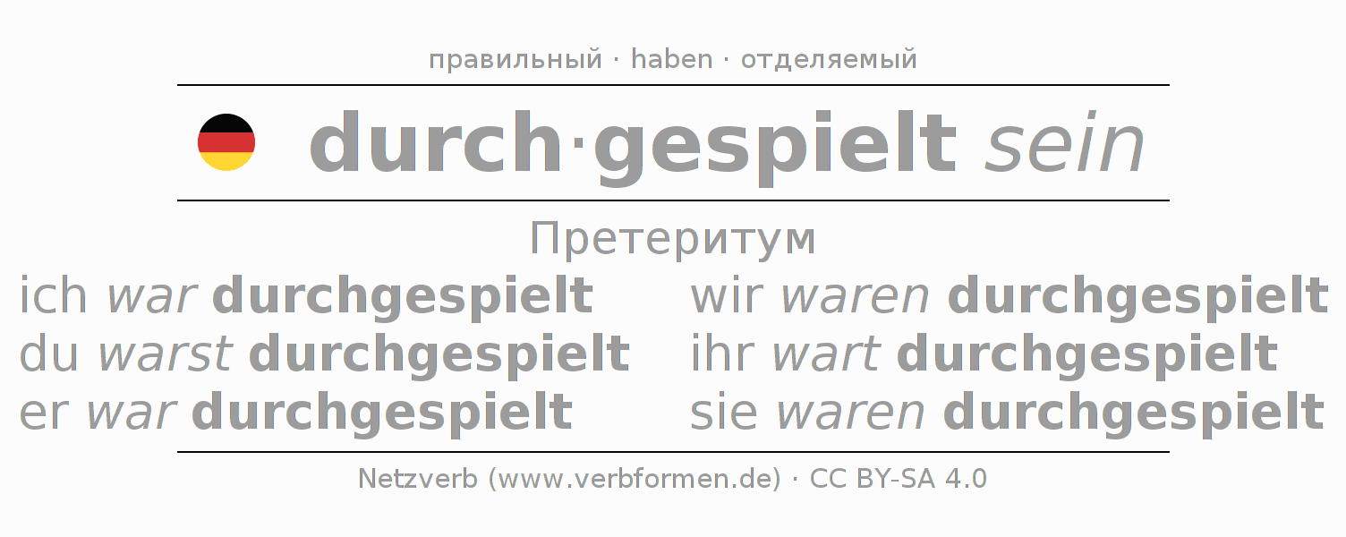 Спряжение durchspielen в Претеритум Индикатив Прошлое время Пассив с sein: ich war durchgespielt, du warst durchgespielt, er war durchgespielt, wir waren durchgespielt, ihr wart durchgespielt, sie waren durchgespielt.Образование этих форм происходит по определённым грамматическим правилам. Так же спрягаются простые глагольные формы durchspielen в Претеритум. Kомментарии ☆